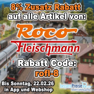 Bis Sonntag den 22.2.26 gibt es auf www.besserePreise.com und in unserer App 8% Zusatz Rabatt auf alle verfügbaren Roco und Fleischmann Artikel mit dem Rabatt Code „rofl-8“!
