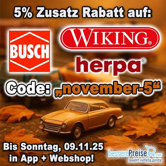 Bis zum Sonntag, den 9.11.25 erhaltet Ihr bei uns im Shop und in unserer Shop-App 5% Zusatz Rabatt auf alle verfügbaren Herpa, Busch und Wiking Artikel mit dem Code „november-5“!