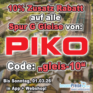 Jetzt für kurze Zeit auf www.besserePreise.com und in unserer App 10% Zusatz Rabatt auf alle verfügbaren Piko Spur G Gleise mit dem Code „gleis-10“ sichern!