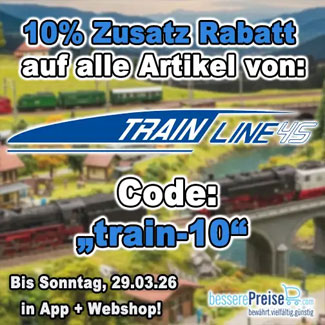 Jetzt für kurze Zeit auf www.besserePreise.com und in unserer App 10% Zusatz Rabatt auf alle verfügbaren Train Line 45 Artikel mit dem Code „train-10“ sichern!